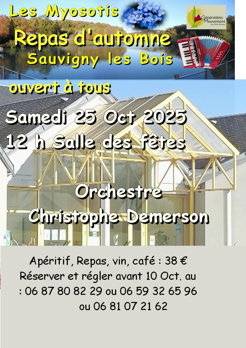 Repas d'automne organisé par Les Myosotis à la salle des fêtes de Sauvigny-les-Bois à 12h00.